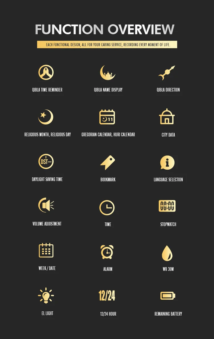 Qibla name display、Qibla Direction、Religious month、 Religious day、Gregorian calendar, Hijri calendar、City data、summer time、Bookmark、Language selection、Volume adjustmentRemaining batteryTime, Chrono,Alarm, Date, Week, EL Light,12/24 hour clock, ame Display.